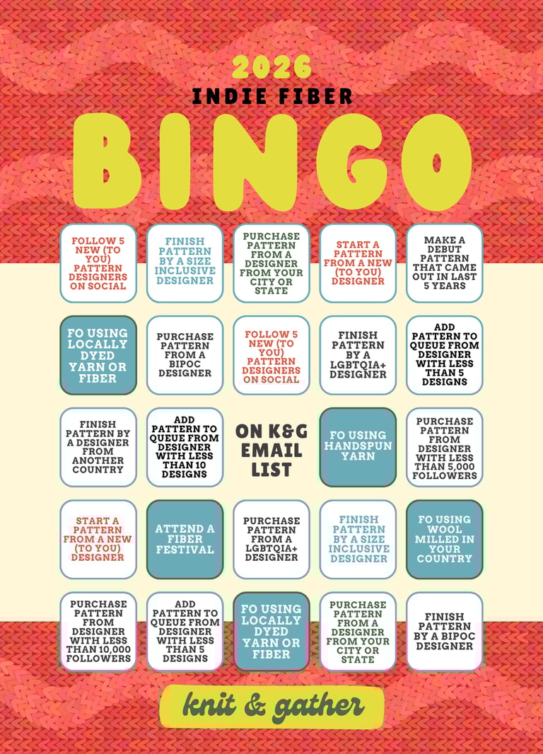 This is the first year for Knit & Gather's Indie Fiber Bingo! We wanted a way to celebrate smaller and newer pattern designers (like us!) who might not have the reach or following as some of the bigger designers. Knitters, crocheters, sewists, spinners, and weavers welcome!
