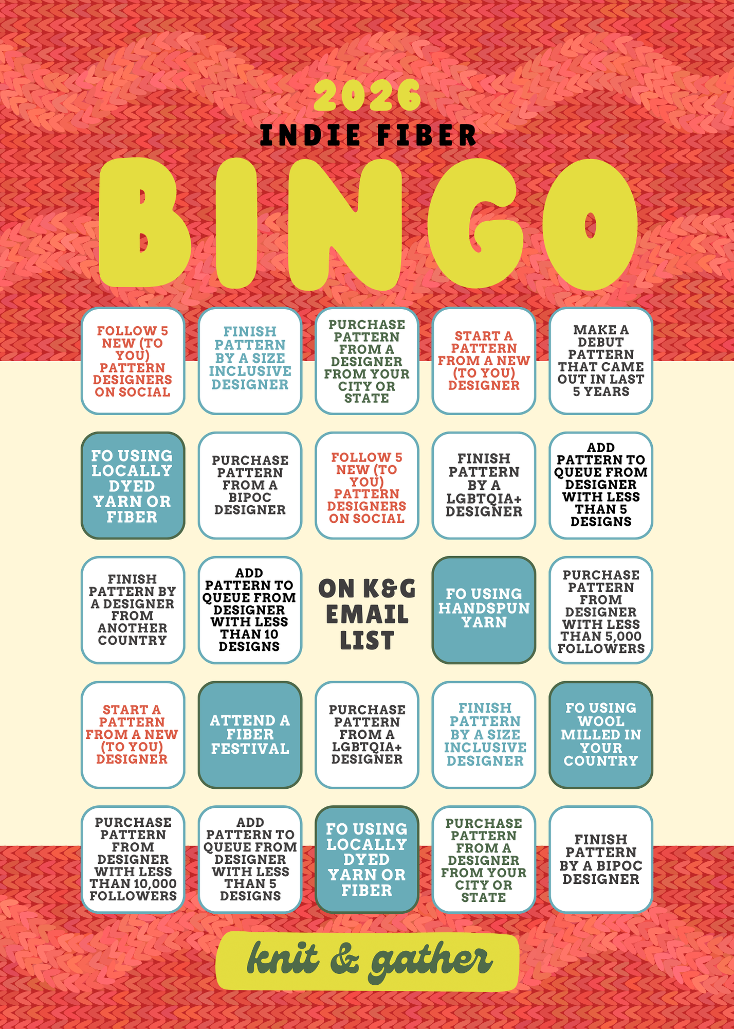 Keep track of your projects (this is on the honor system); only projects made in 2026 are eligible. There will be prizes for bingos and one larger prize for blackouts! If you have a prize to donate, please reach out to us. Our contact and email list sign up are down in the footer of this site.